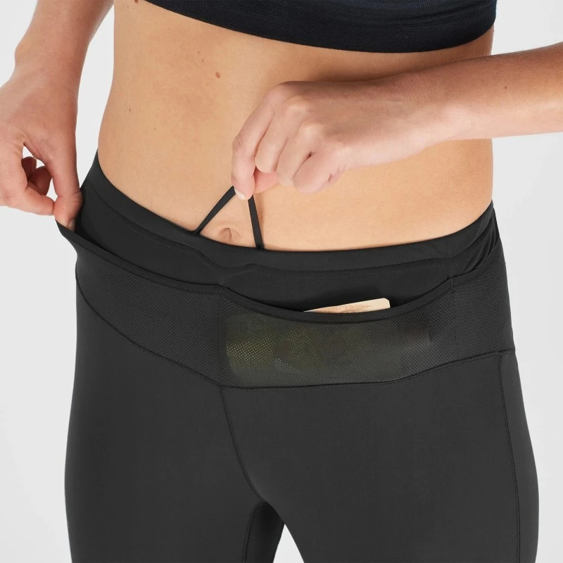 Ceinture stretch avec pas moins de 4 poches en mesh intégrées tout autour de la taille pour une polyvalence maximale et un rangement rapide en mouvement. Testée et approuvée avec une softflask de 250 ml, une veste coupe-vent légère, un smartphone (~15 cm x 7 cm) et 2 gels.