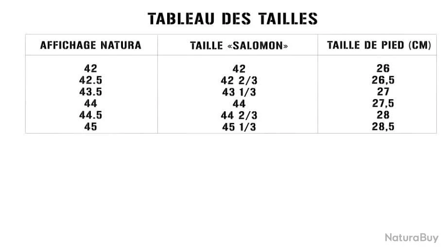 Attention Natura ne proposant pas le taille « salomon » merci de bien prendre en compte le tableau des tailles ci-dessous avant de commander :