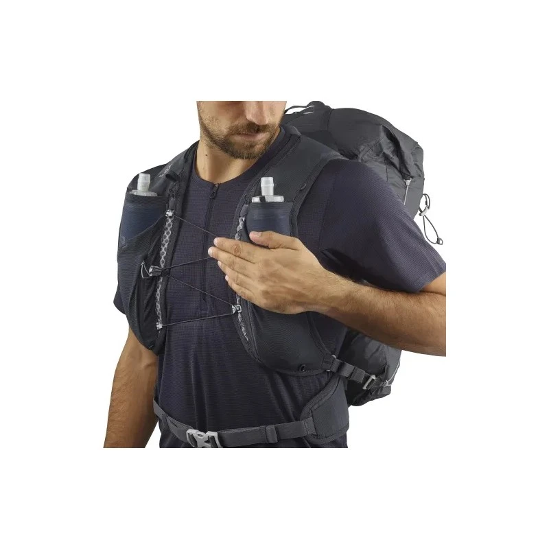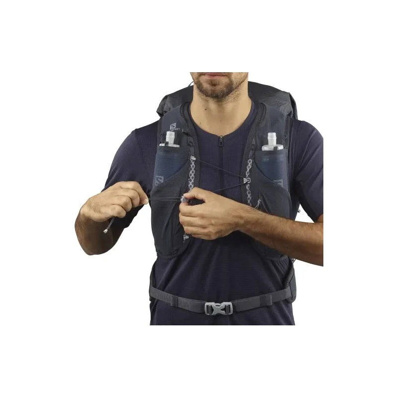 Conçues pour accueillir les softflasks Salomon, ces poches avant réduisent l’effet de ballottement. Les boucles élastiques supérieures maintiennent parfaitement vos bouteilles à portée de main.